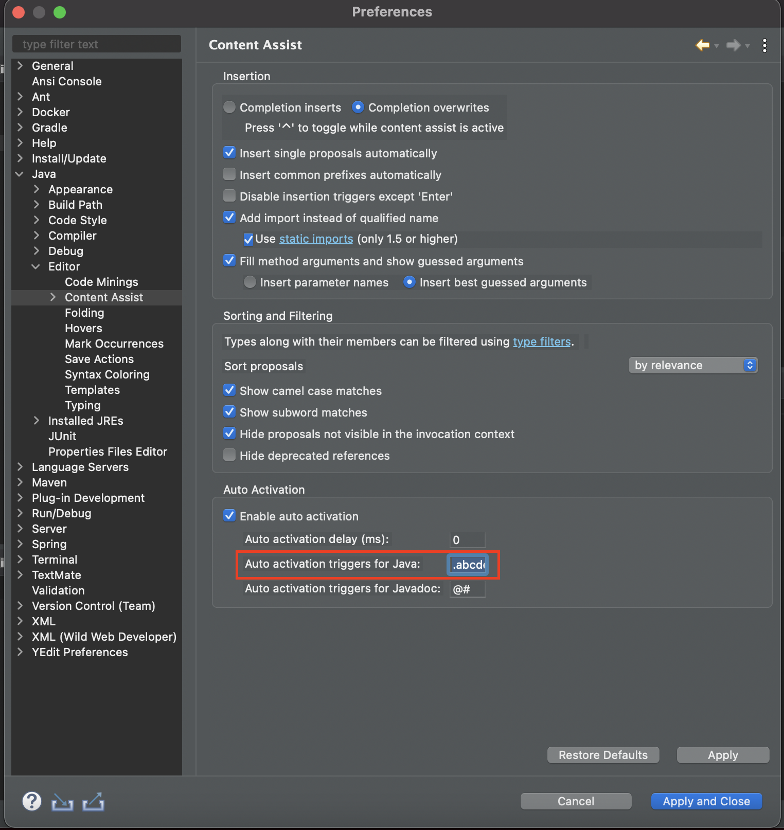 Auto activation triggers for Java 값을 .abcdefghizklmnopqrstuvwxyz 로 바꿔주면 된다.